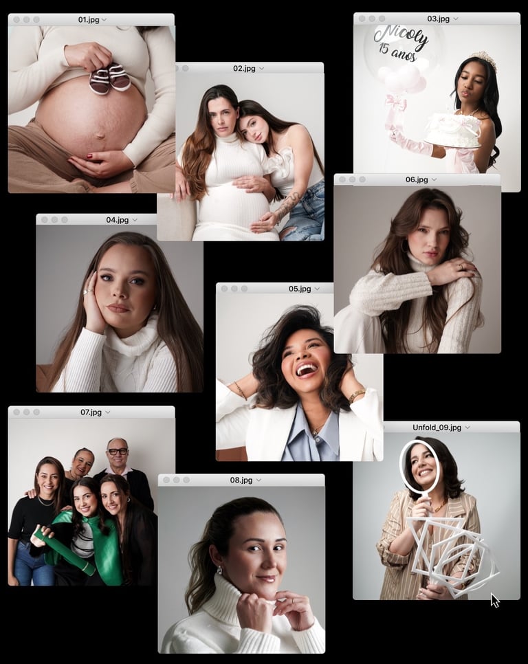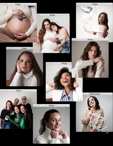 Um ambiente controlado, com iluminação e cenários personalizados, ideal para retratos profissionais, individuais, em família ou casal.